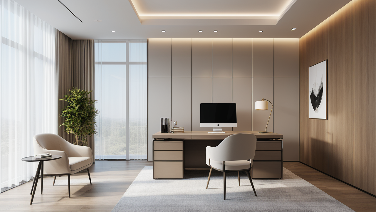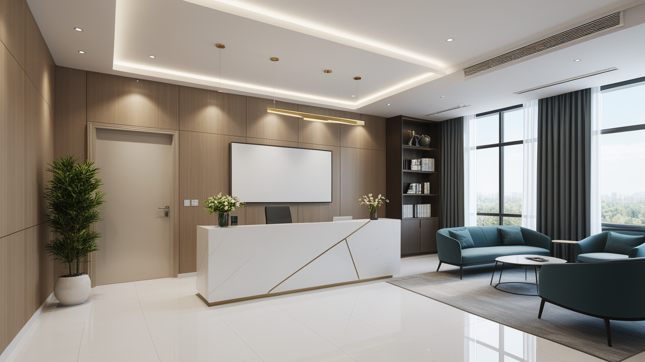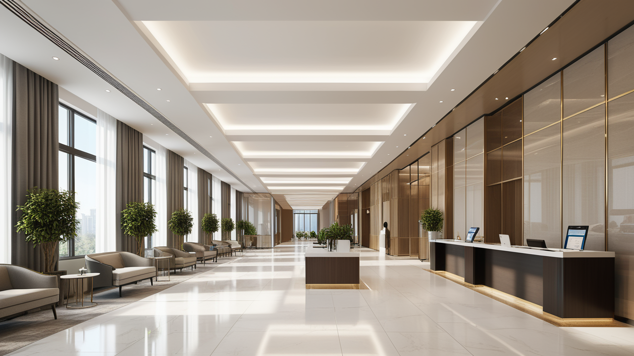 本案設計中企業形象墻,以其企業文化的新興、蓬勃、嚴謹為主題,兩側以“居有竹、步步高”的銀色墻柱帶來視覺沖擊感,加上企業形象色的類比色、淺色石材及不銹鋼條的運用,顯示出金屬的質感和工業文明的主題;然而休息區的陳設卻明麗蔥郁,充滿人文情感的自然氣息,恰恰彌補了視覺中的剛硬個冷竣,使人倍感親切。