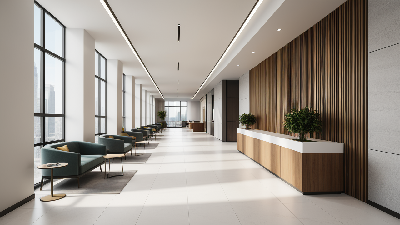本案設計為突顯建筑開間較舒適之優點,設計師特意設計了過道各柱體間鑲嵌不銹鋼條及玻璃幕墻上的磨砂條來點綴的裝修主題,同時,地面用拼花色帶打破,與方正而美觀的吊頂上下呼應;辦公室靠近走道的墻面,為將自然光透入走道,同時又加強其“靈透”感,采用清玻幕墻,幕墻上的磨砂條既打破了玻璃墻面的呆板,又提醒了行人幕墻的存在,防止無意識碰頭、沖撞等類似意外發生;為辦公室的后續私密性考慮,其清玻幕墻內掛以百葉窗遮擋既可。