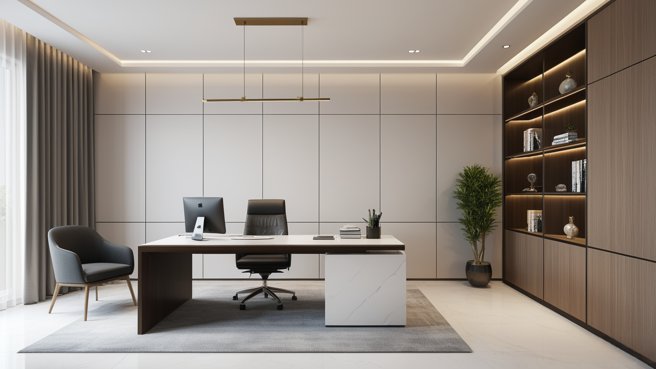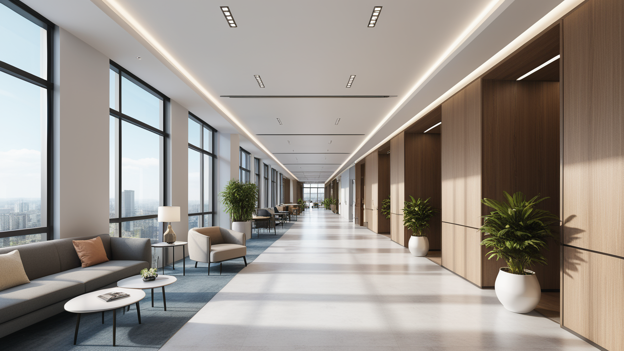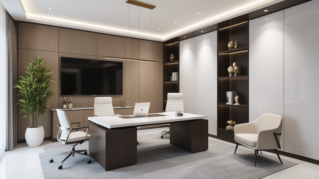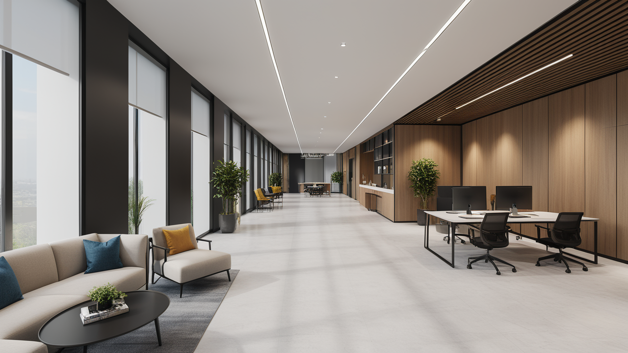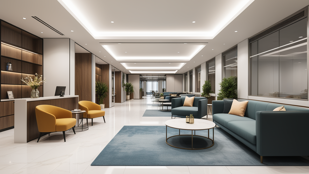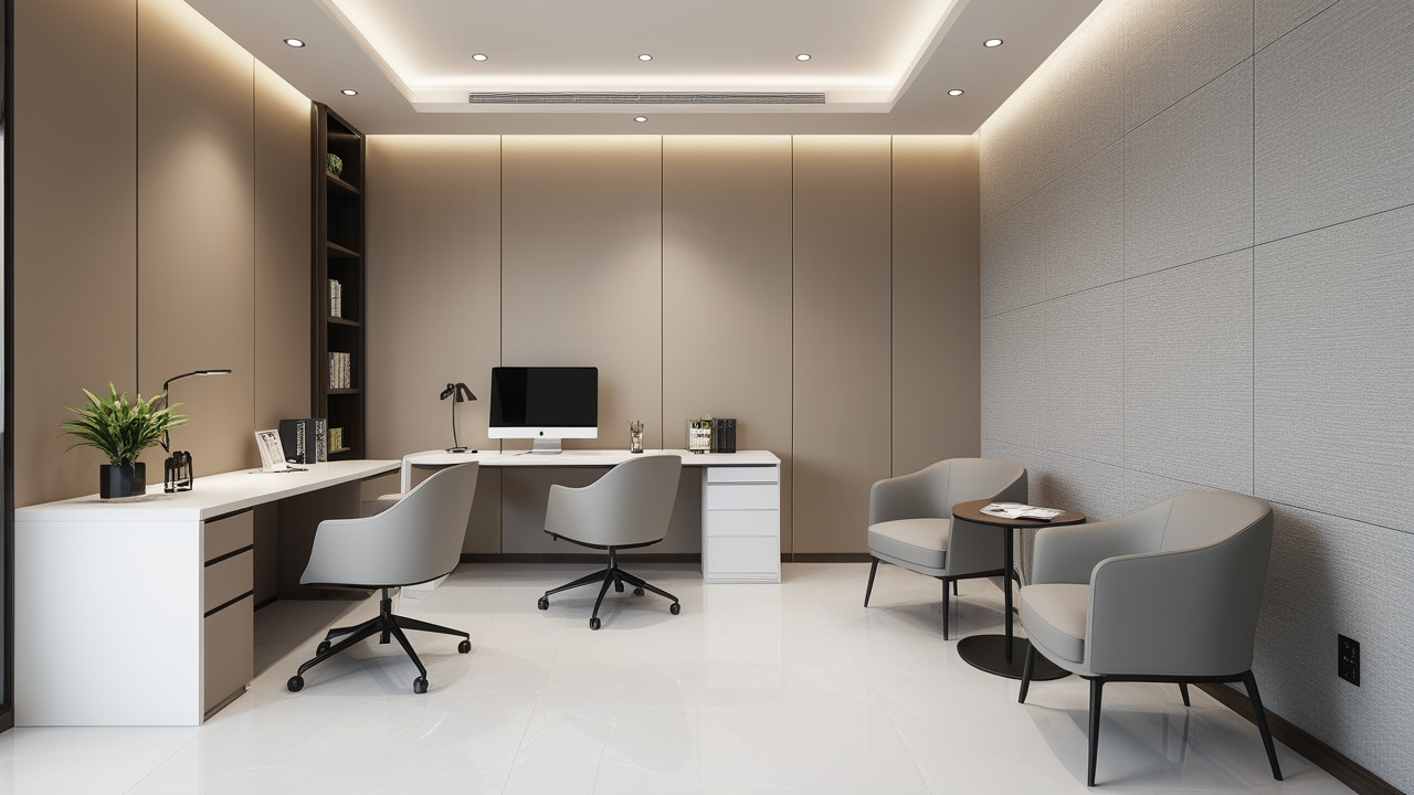 本案設(shè)計以簡潔的裝飾語言,對稱的空間布局,規(guī)范方整、功能健全,與環(huán)境形成交流,最終達成默契,突出了現(xiàn)代辦公環(huán)境講究效率的特征,整體風(fēng)格簡約大方,符合公司的品牌形象和文化,同時也考慮到員工的舒適度和實際工作需求。這個辦公室裝修設(shè)計案例旨在為公司營造一個宜人的工作環(huán)境,提高員工的工作體驗和幸福感,從而推動公司的發(fā)展和成長。"