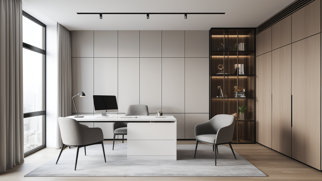 本案在這個辦公室設計中,甲方要求,有功能區設置,有總經理,總經理是本公司中最高的職務,所以在我的設計中給他選擇了一個比較好的朝向,采光比較好、地面采用仿古顯紋復合強化淺色木地板。防滑耐磨。幾何式的辦公桌莊嚴不失人性化。自然的美巧妙的運用到設計之中,突顯對美好生活的向往。放松工作時的狀態,副總經理兩間,裝修風格跟總經理相符,比較統一。會議室,在平面功能上。考慮了合理的行動路線,東面墻對應窗的位置設計了落地的玉砂玻璃隔墻,以滿足展示區的采光要求。