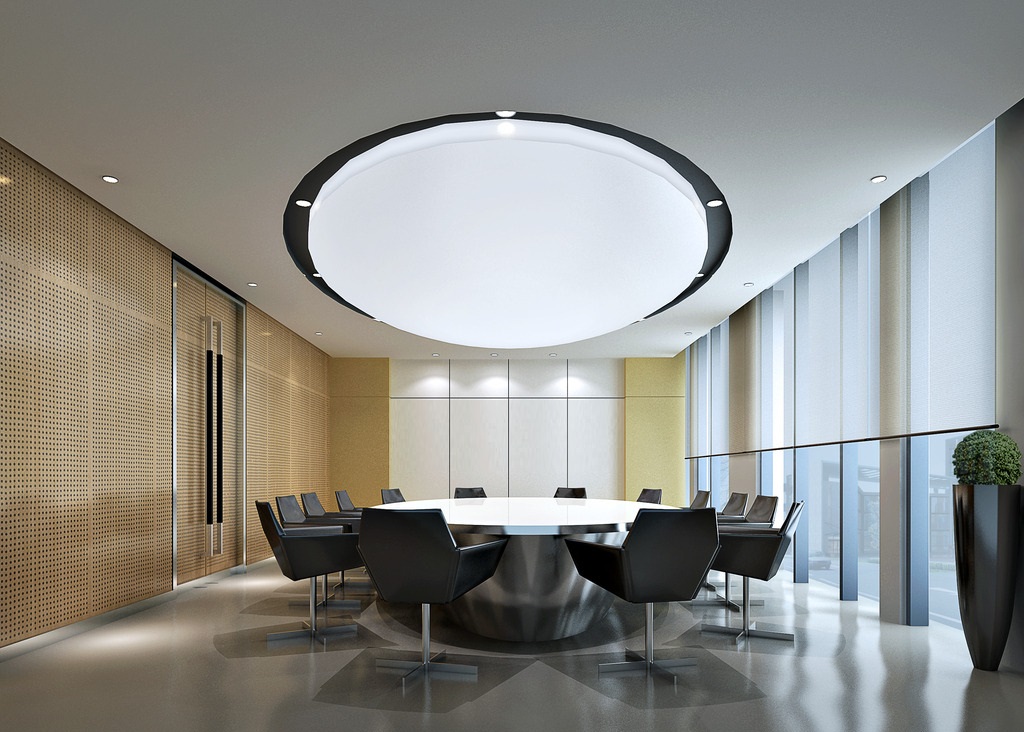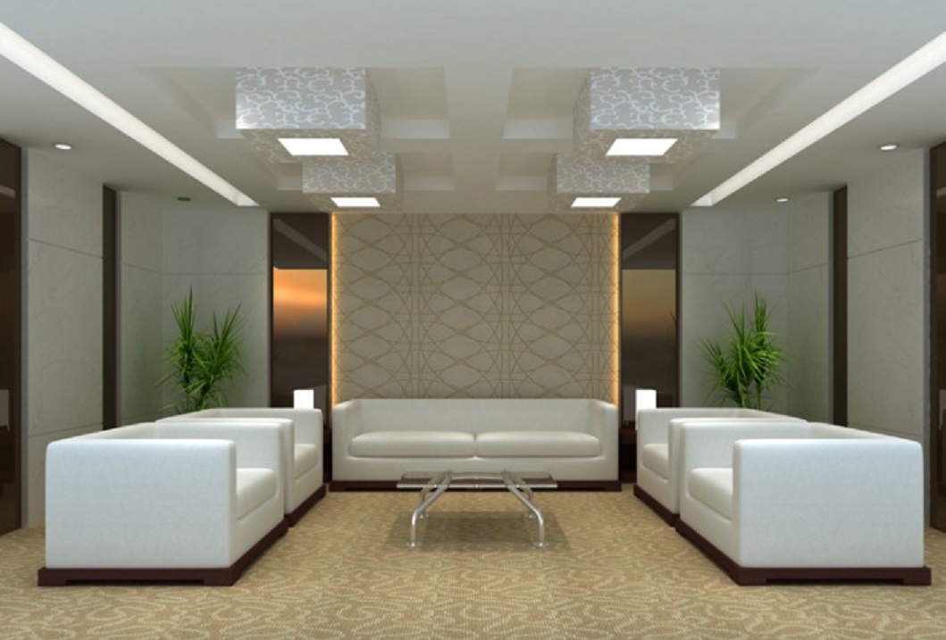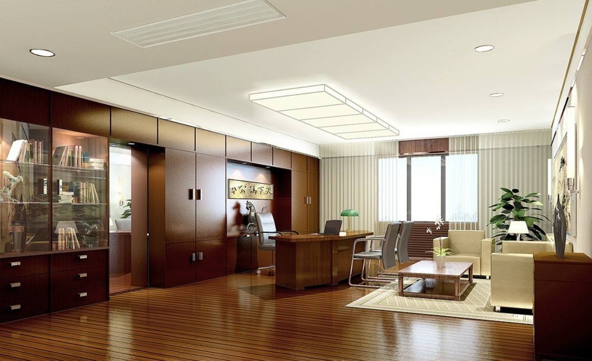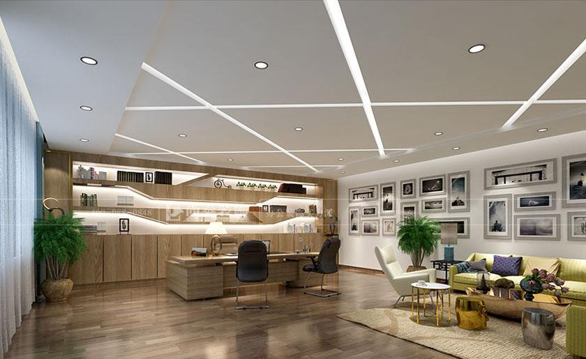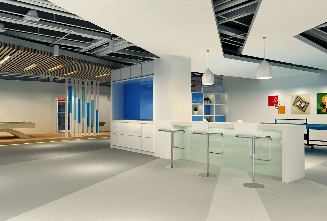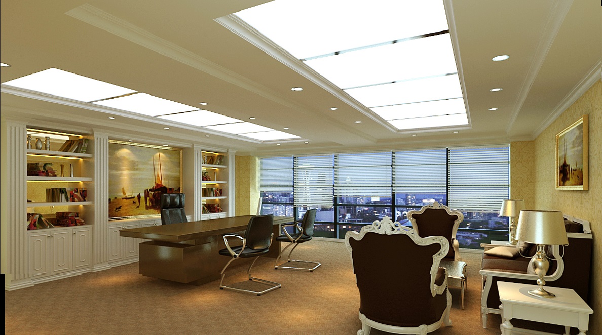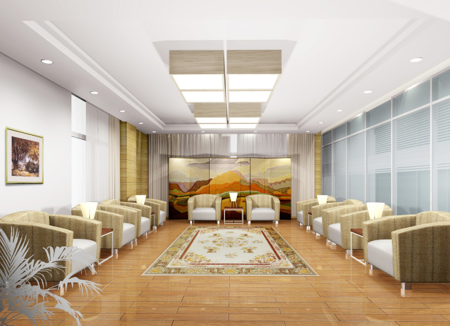 本案設計為突顯建筑開間較舒適之優點,設計師特意設計了過道各柱體間鑲嵌不銹鋼條及玻璃幕墻上的磨砂條來點綴的裝修主題,同時,地面用拼花色帶打破,與方正而美觀的吊頂上下呼應;辦公室靠近走道的墻面,為將自然光透入走道,同時又加強其“靈透”感,采用清玻幕墻,幕墻上的磨砂條既打破了玻璃墻面的呆板,又提醒了行人幕墻的存在,防止無意識碰頭、沖撞等類似意外發生;為辦公室的后續私密性考慮,其清玻幕墻內掛以百葉窗遮擋既可。