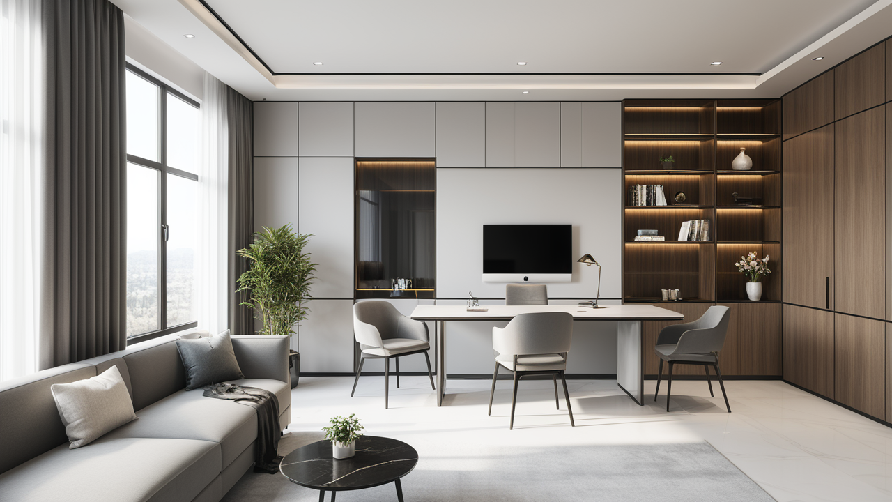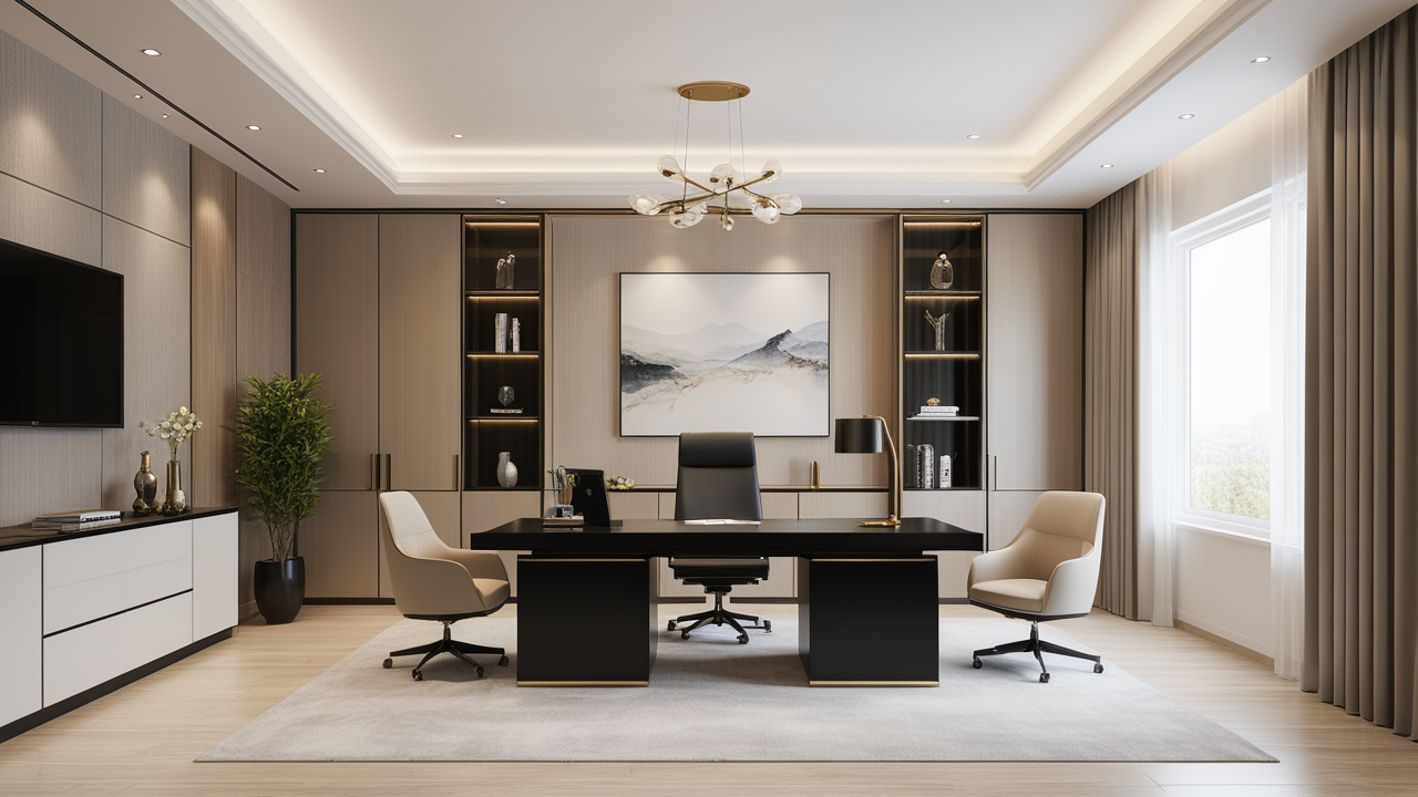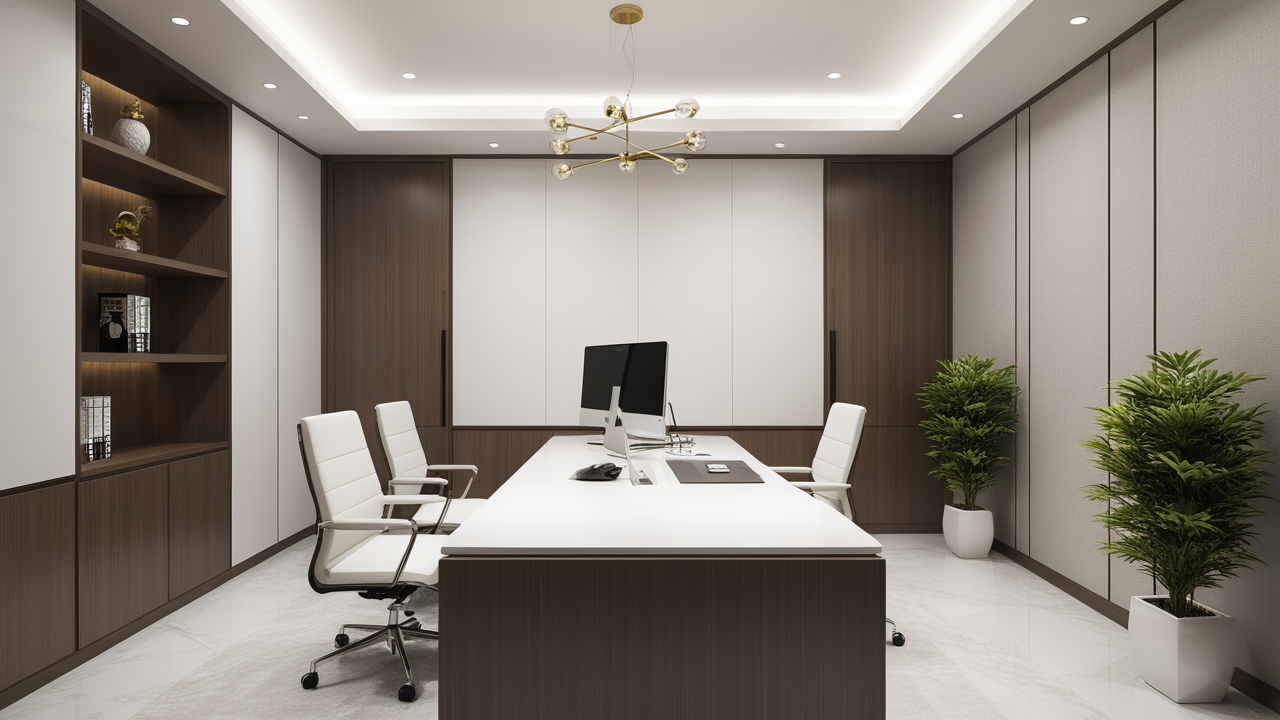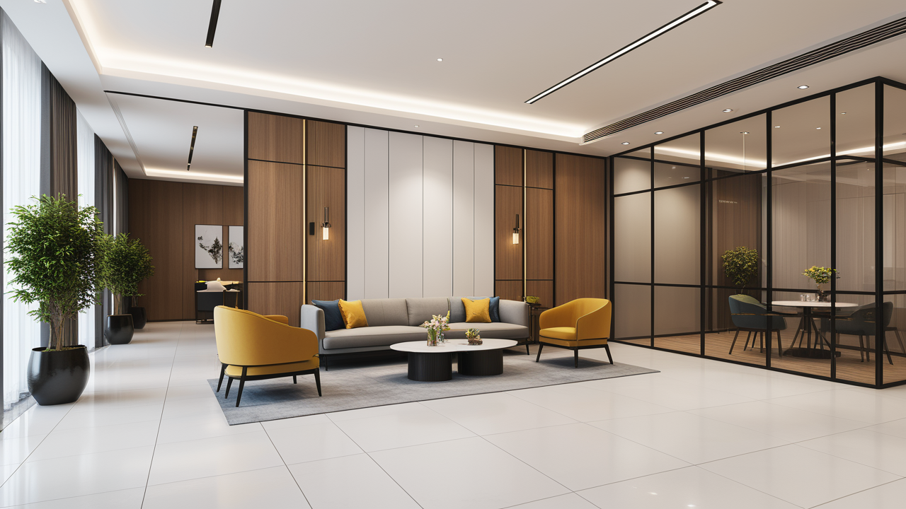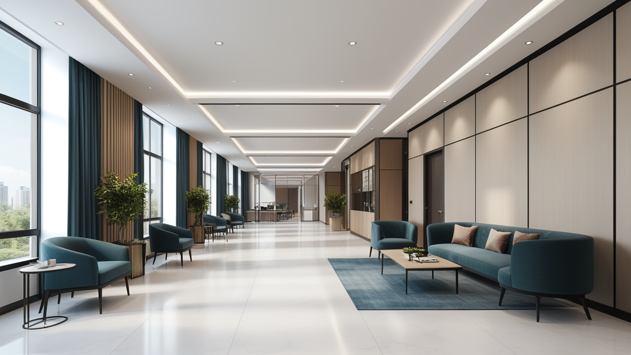本案設計為突顯建筑開間較舒適之優點,設計師特意設計了過道各柱體間鑲嵌不銹鋼條及玻璃幕墻上的磨砂條來點綴的裝修主題,同時,地面用拼花色帶打破,與方正而美觀的吊頂上下呼應;辦公室靠近走道的墻面,為將自然光透入走道,同時又加強其“靈透”感,采用清玻幕墻,幕墻上的磨砂條既打破了玻璃墻面的呆板,又提醒了行人幕墻的存在,防止無意識碰頭、沖撞等類似意外發生;為辦公室的后續私密性考慮,其清玻幕墻內掛以百葉窗遮擋既可。
