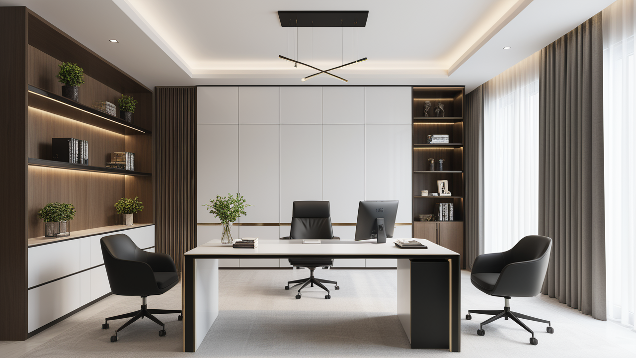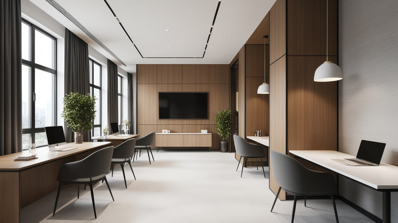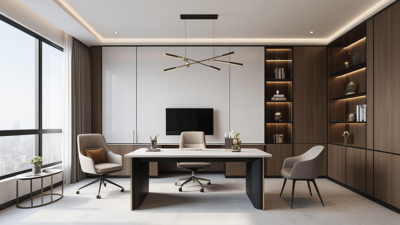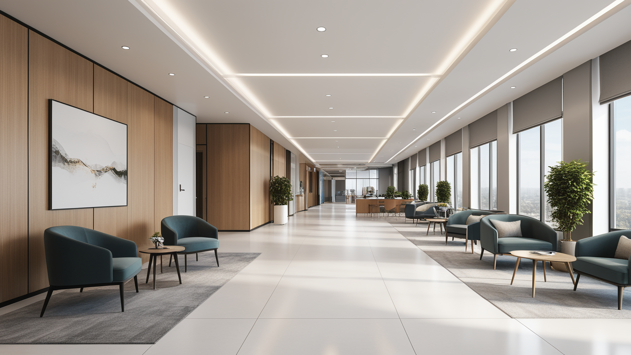 本案設計在處理上,特設計了可向客戶展示企業(yè)榮譽品的展示墻,用料實際,無須雕琢張揚,直線條的造型讓整個空間顯得穩(wěn)重大方,淺色系材料的運用延續(xù)了靈動而清澈的氣韻,大方莊重卻內含現(xiàn)代時尚。而且色調淡雅的地毯、沙發(fā)、背景,還突出了接待廳親切、和睦、寬松的氛圍,使穩(wěn)靜而坦誠的晤談氣氛盎然一室。