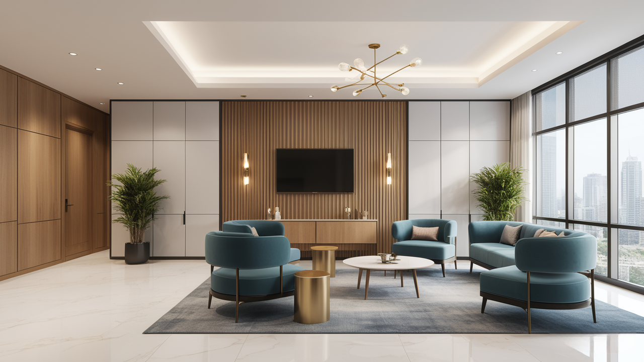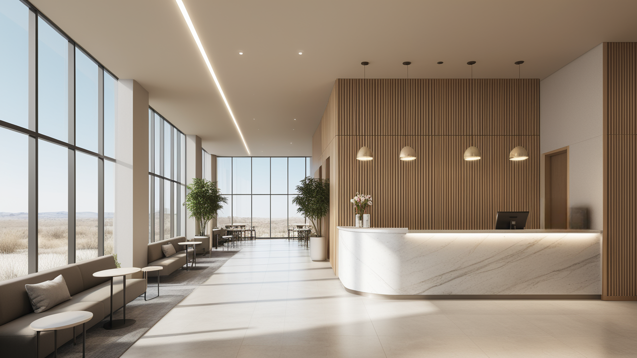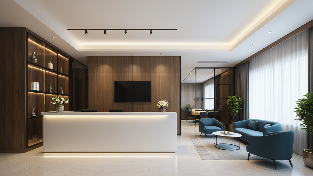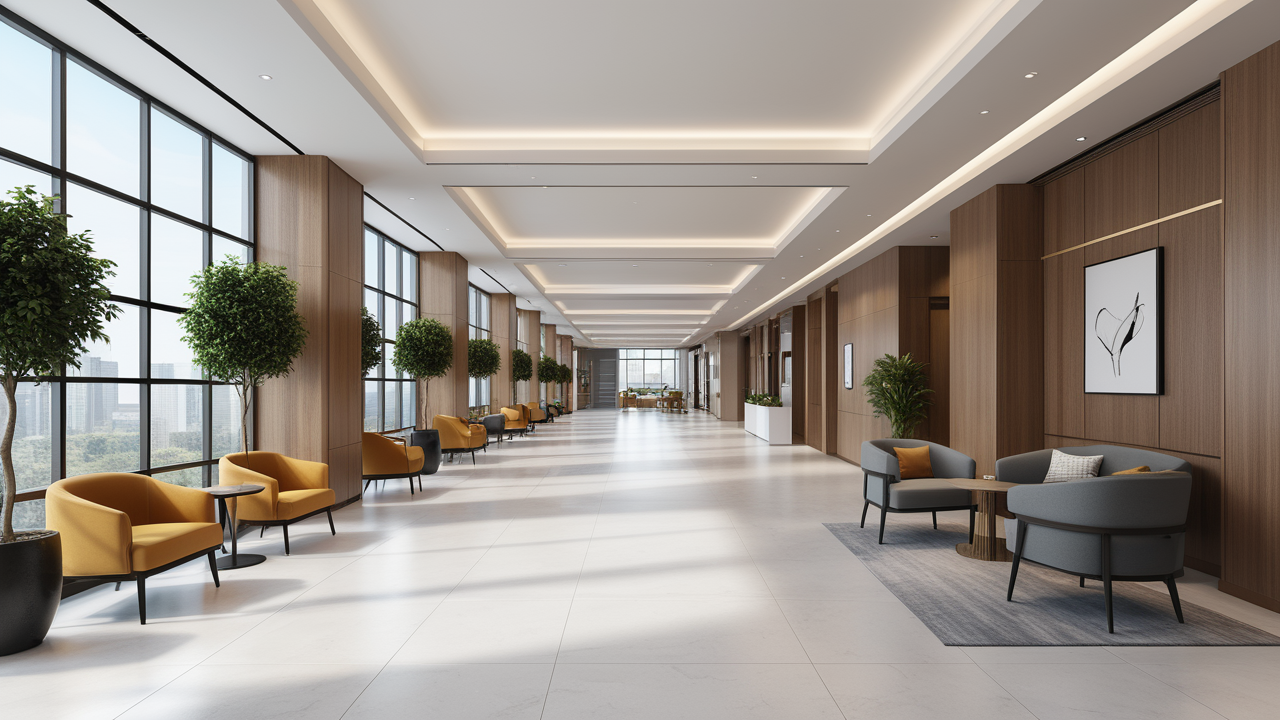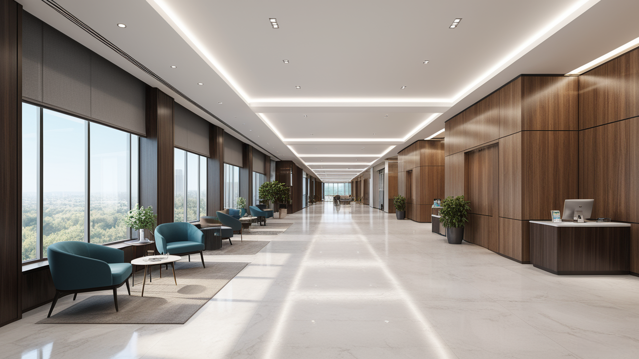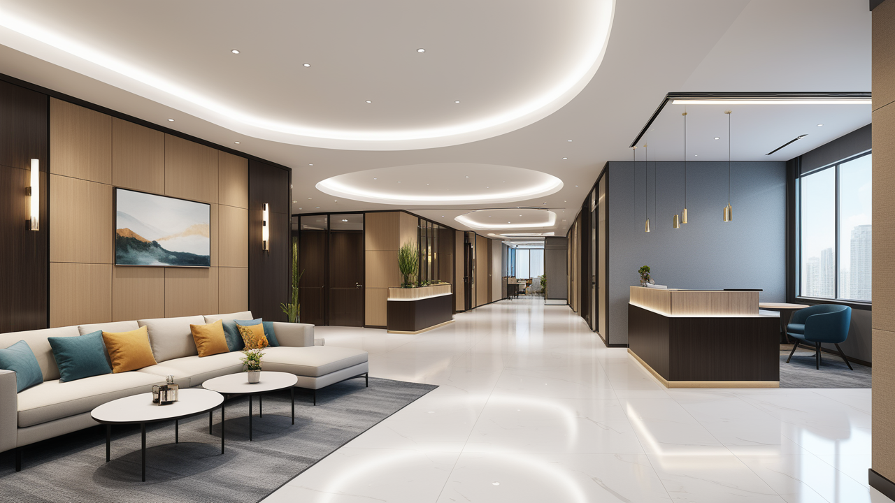 本案設(shè)計(jì)首先闖入眼簾的是企業(yè)形象墻,以其企業(yè)文化的新興、蓬勃、嚴(yán)謹(jǐn)為主題,兩側(cè)以“居有竹、步步高”的銀色墻柱帶來(lái)視覺(jué)沖擊感,加上企業(yè)形象色的類比色、淺色石材及不銹鋼條的運(yùn)用,顯示出金屬的質(zhì)感和工業(yè)文明的主題;華堂上方呼應(yīng)以直線為主調(diào)、大筆勾勒而出的時(shí)尚型弧面吊頂,大直大方顯示出強(qiáng)烈的縱深感,加之以清透、明媚的光色渲染,工整氣派、大家風(fēng)范,反襯出貴公司辦公樓的現(xiàn)代時(shí)尚特性,以干練快捷的設(shè)計(jì)節(jié)奏,展示出質(zhì)量與效率并舉的時(shí)代精神。